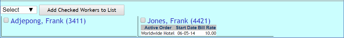 Note: You can see on this screen if a worker already has an active Order at the property and confirm the bill rate on the existing Order. Notice on the right that Jones, Frank has an active Order at Worldwide Hotel, but Adjepong, Frank does not have any active Orders listed.