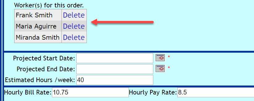 Note: If you accidentally added a worker by mistake, simply click the Delete link to remove them from the list. Then, proceed with creating Orders for the rest of the workers.