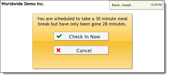 - If the worker tries to check-in less than 30 minutes after they checked out for their meal break, the message shown below appears: