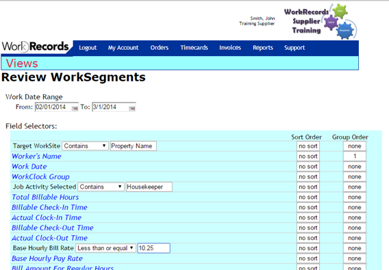 To help manage the tracking of training hours, we recommend using a Review WorkSegments View or TimeCard View. By setting a wide date range (to make sure you capture everything) and then adding a target worksite, rate, job activity, or note, you can save the View and then set Alerts to make sure the appropriate team members are aware when the initial Order needs to be closed, any additional capture of billing is completed, and the new Order is entered. The selectors you choose will vary based on your agreement, but an example of what could be entered is shown below.