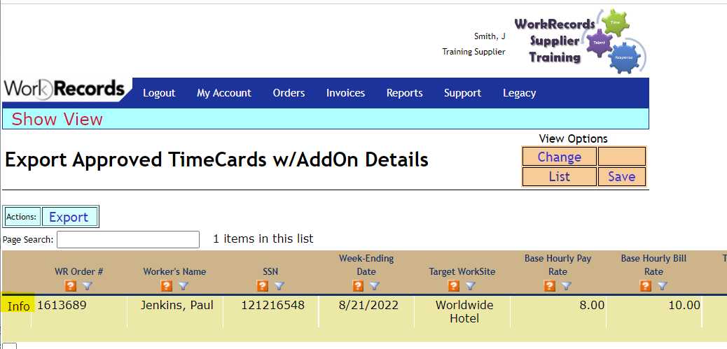 Step Two: After using the view to find the TimeCard, select the blue Info hyperlink on the far left of the results.