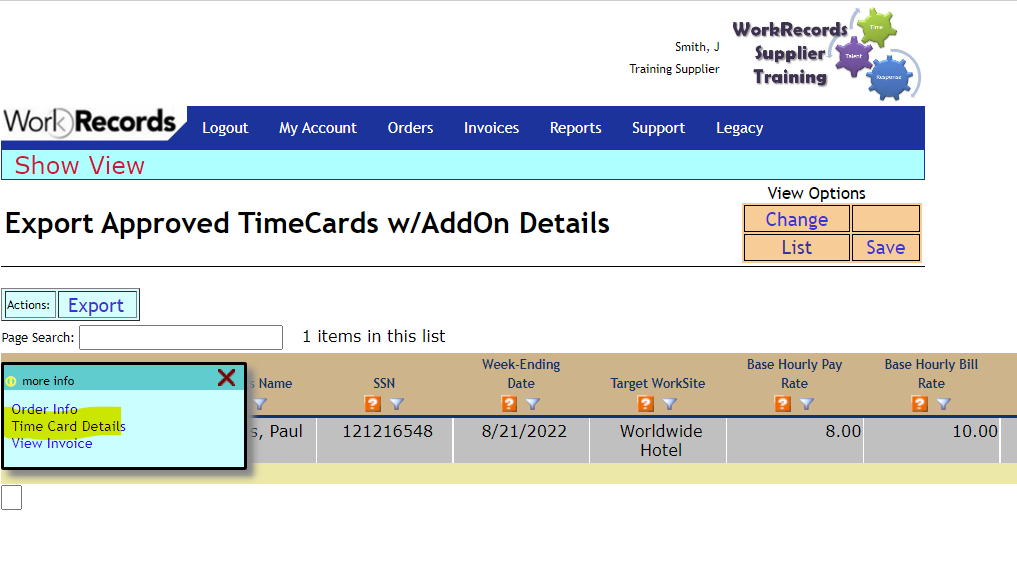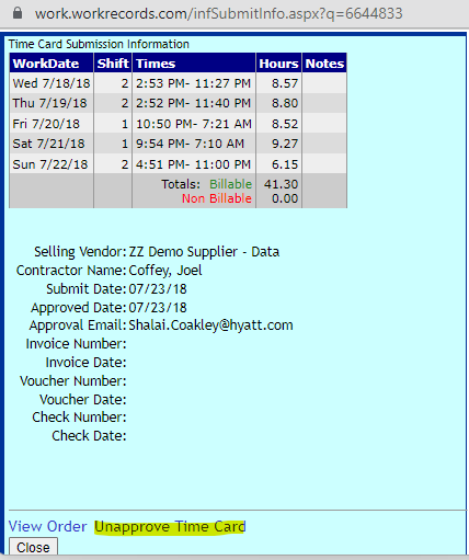 Labor Suppliers can unapprove a weekly TimeCard if the TimeCard has not been invoiced. Due to the impact on payroll processing, Labor Buyers cannot unapprove TimeCards. Labor Buyers should contact WorkRecords Support or their Labor Supplier for assistance if a TimeCard needs to be Unapproved.