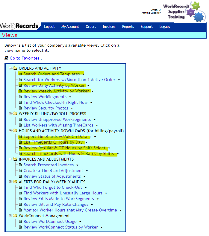 Step One: After going to Reports on the blue menu bar and clicking on My Views, choose any of the reports highlighted below. We'll walk you through the steps using the Export TimeCards w/AddOn Details view.