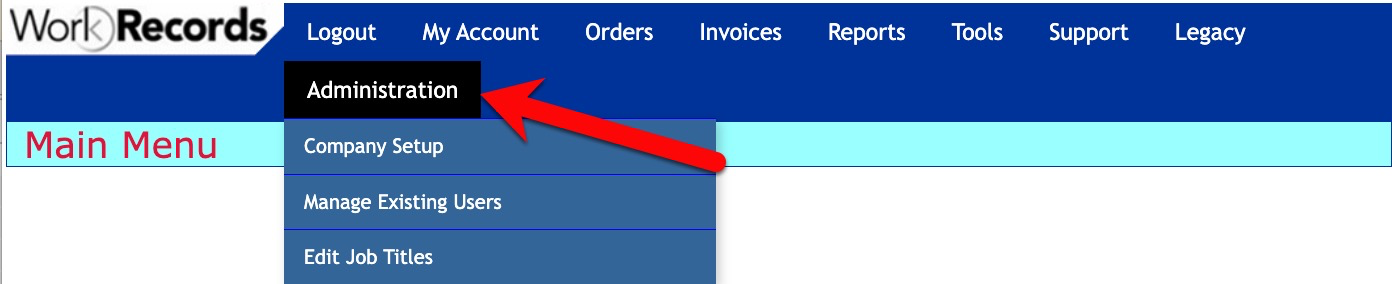 When you log into WorkRecords with Admin access, you will see an Administration tab on the blue menu bar. Clicking Administration provides three options: