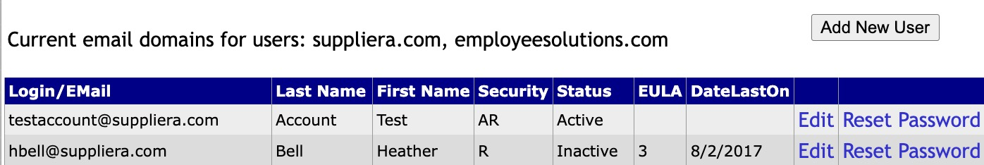 The Manage Existing Users area shows every user account that has been created for your company. For each user, you can see:
