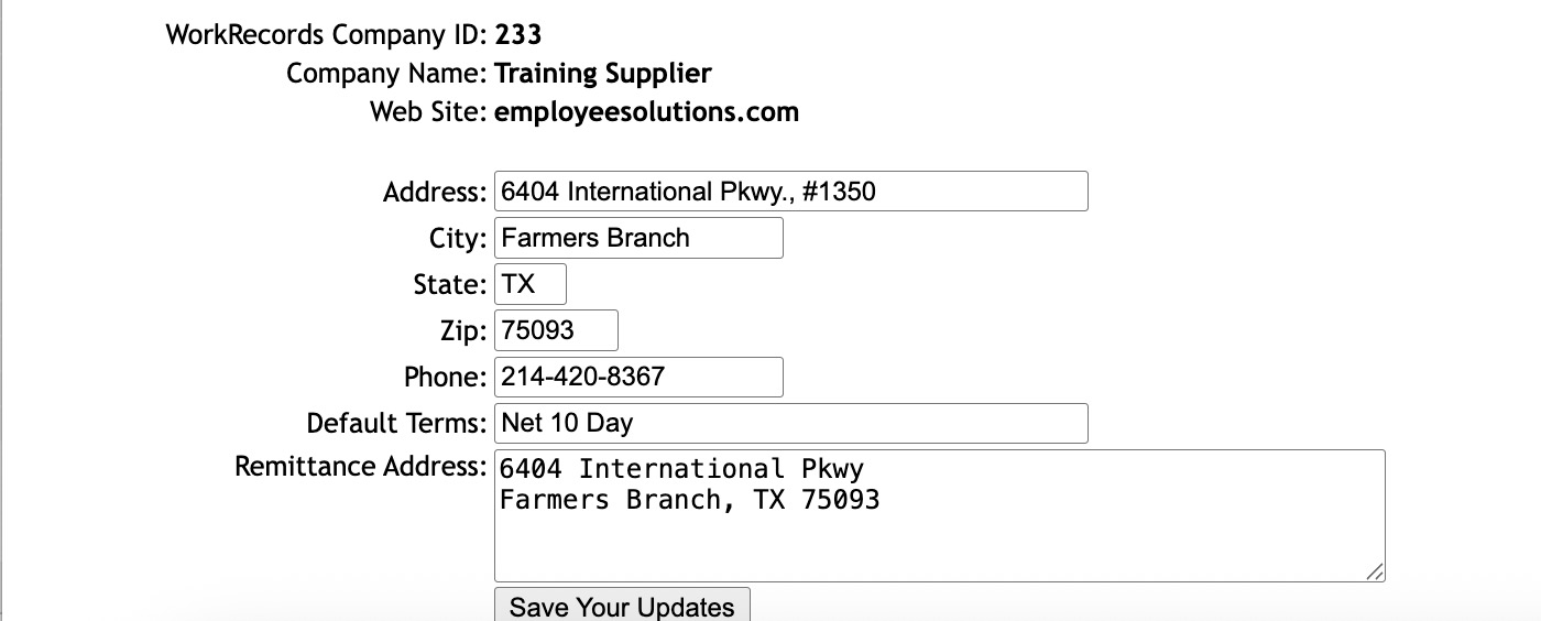 Default Terms and Default Remit Address are important. These are defaults only. If your company has special invoice terms or a special remit address for a specific customer, those customer-specific settings will override anything entered here. With Admin access, you can update the defaults, but you cannot modify customer-specific invoice terms or remit addresses. To change anything that is specific to an individual customer, submit a Support ticket or email support@workrecords.com.